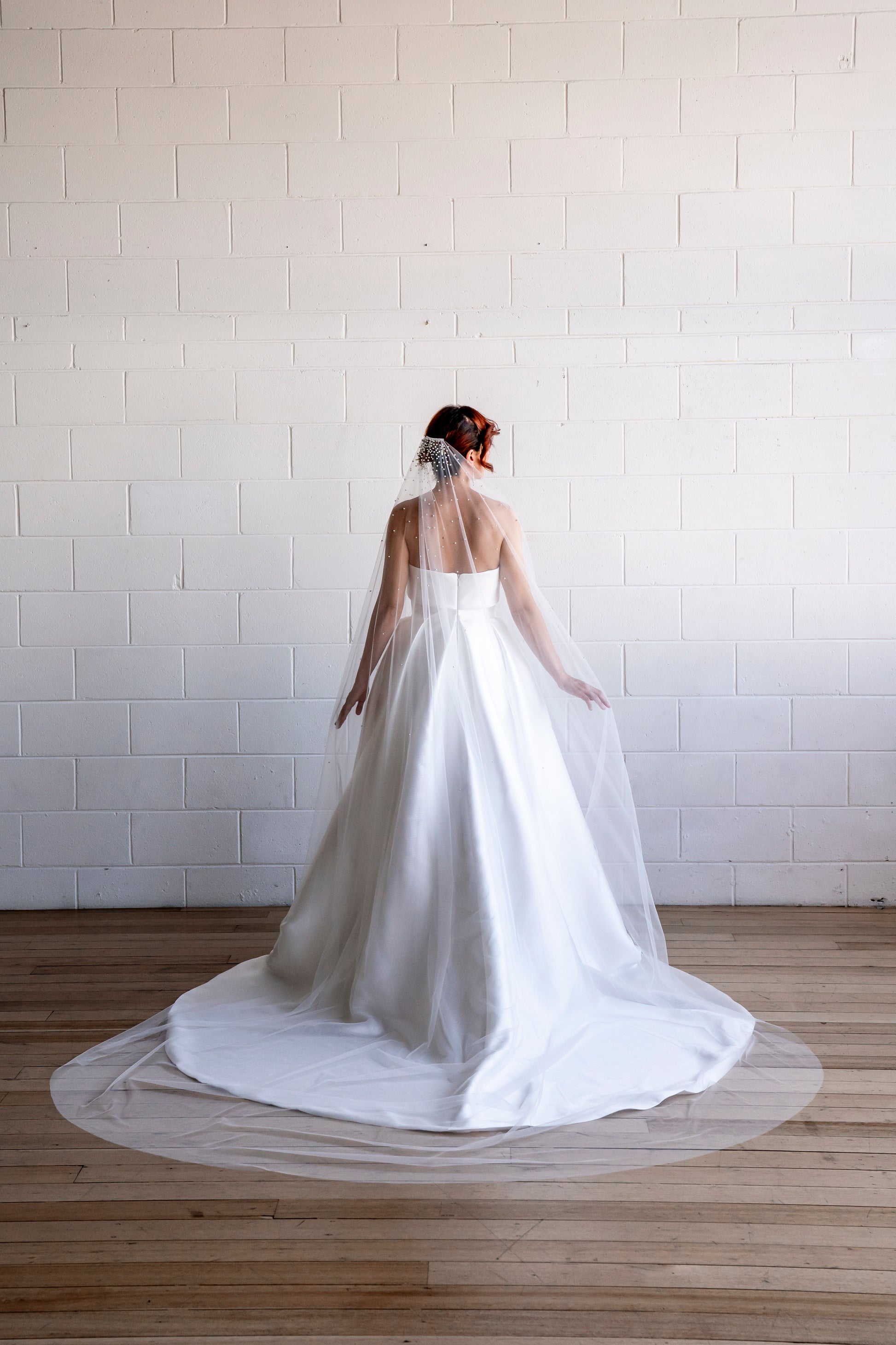 Crafted from soft tulle, this veil drapes beautifully, adding a dreamy finishing touch to any bridal look. Whether paired with a minimalist gown or a lace masterpiece, Daphne enhances without overpowering - perfect for the bride who wants subtle sparkle and sophistication.