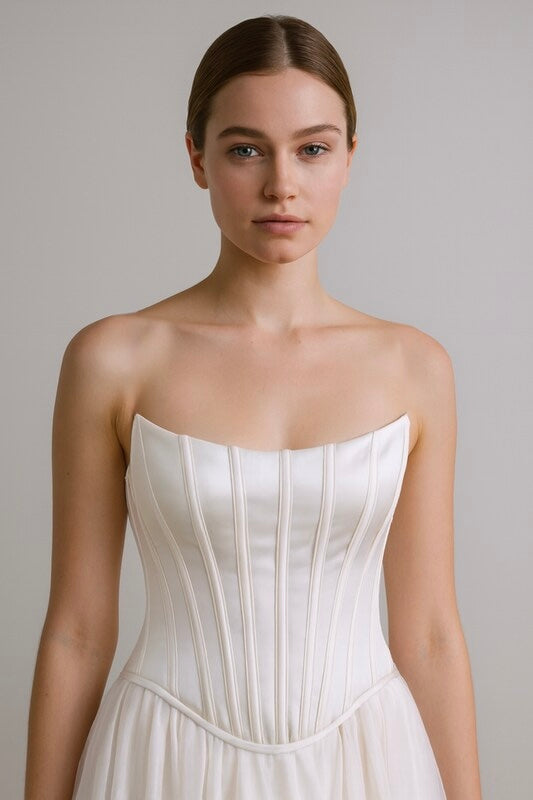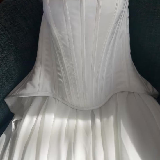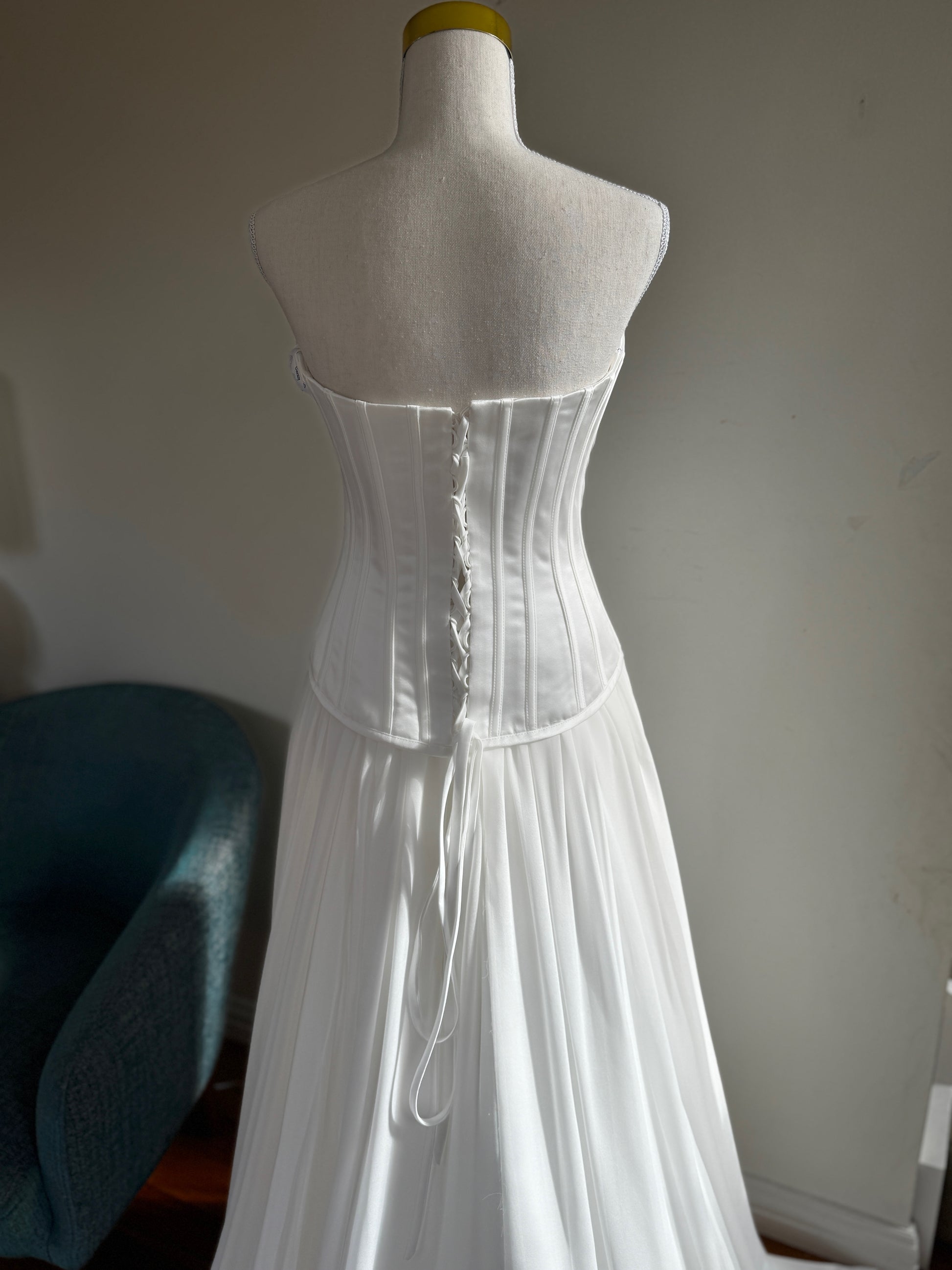 This unique gown features a delicate corset top with a lace-up back, allowing for an adjustable and perfect fit. The look is completed by a graceful, flowy chiffon skirt that fastens with a zip.