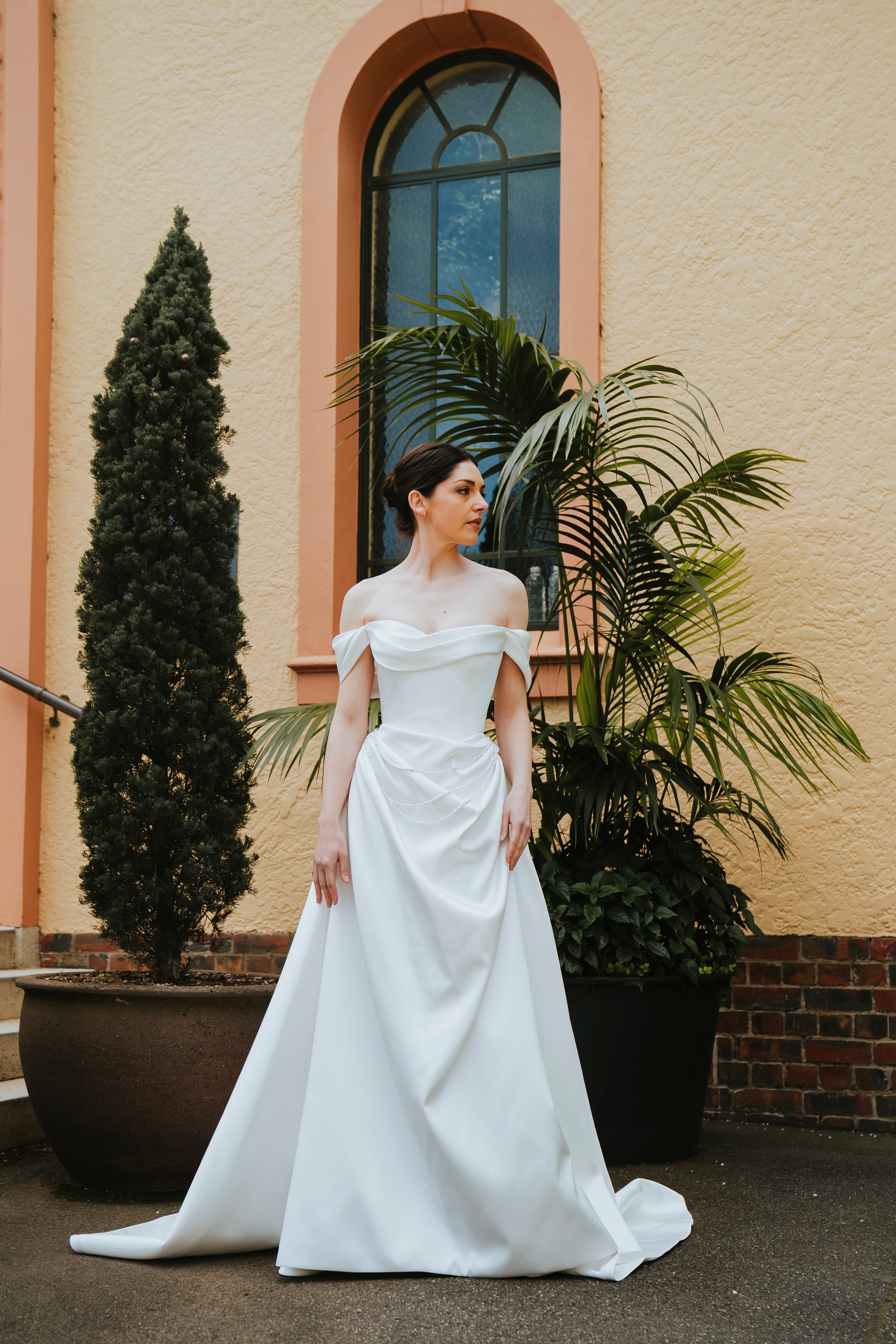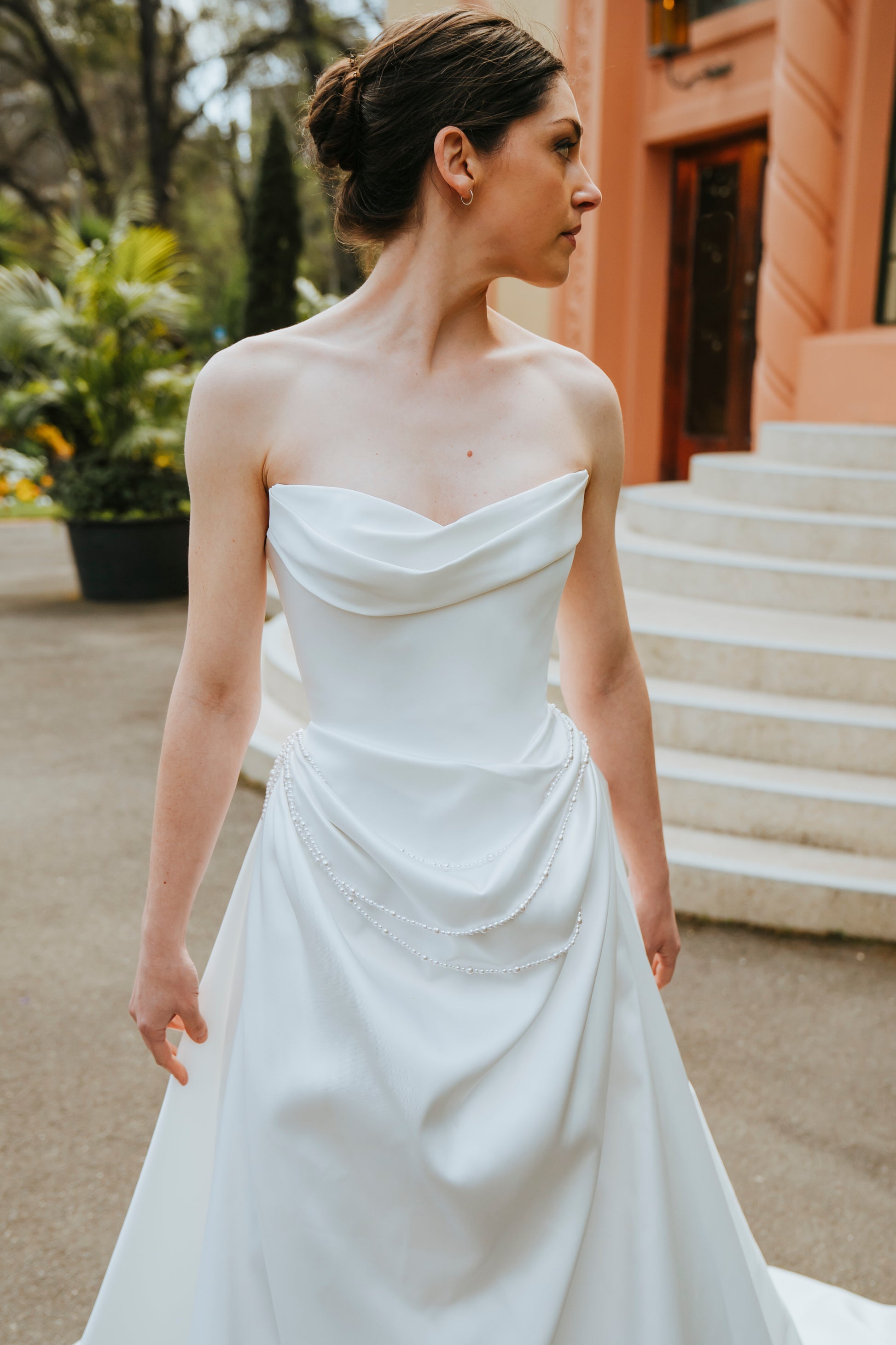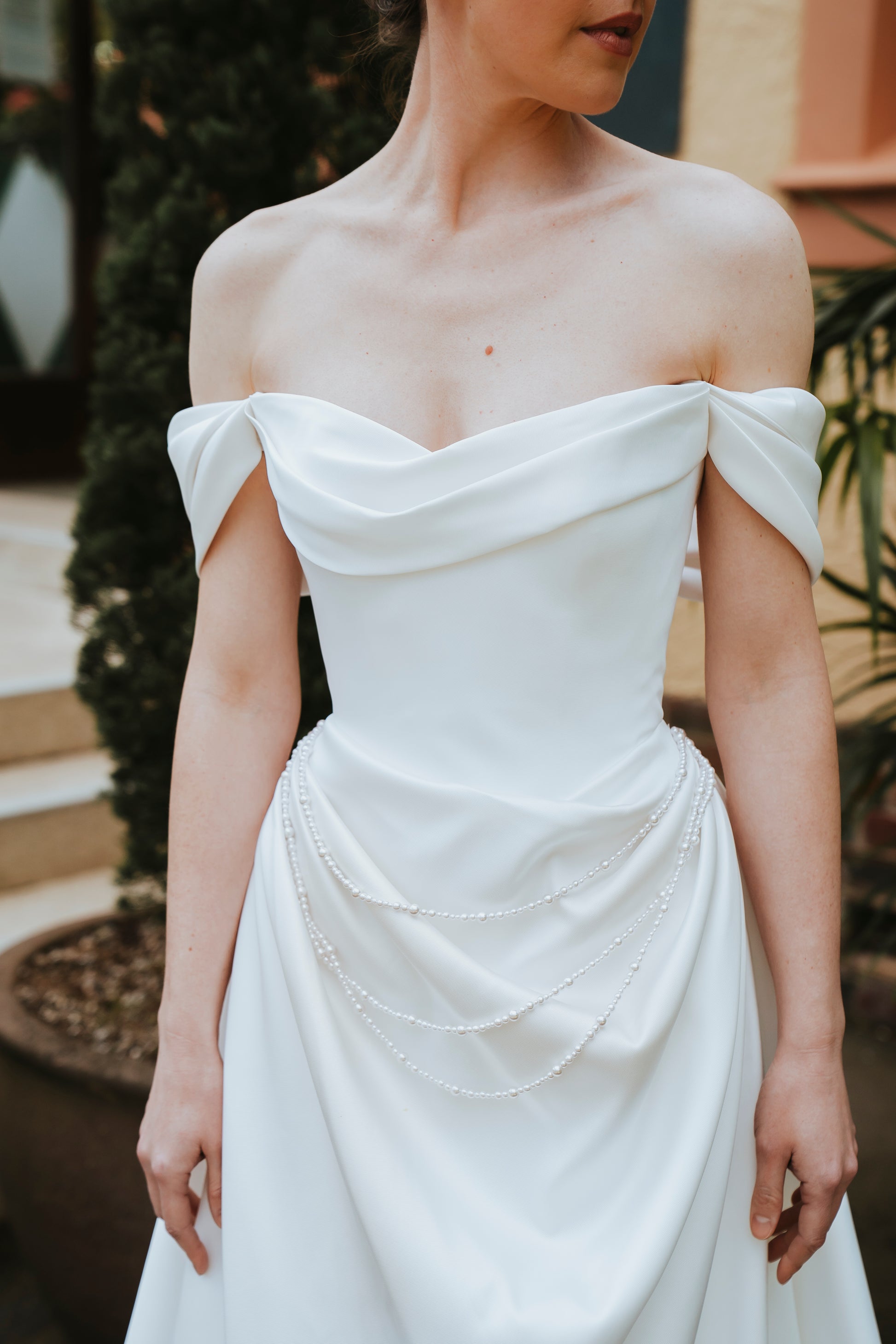 A modern romantic gown with a soft feminine allure. Gigi features a delicately draped bodice with a flattering sweetheart neckline and optional off-shoulder straps that can be removed for a sleek strapless look. The fitted silhouette hugs the figure before flowing into a soft train, balancing timeless elegance with modern charm.
