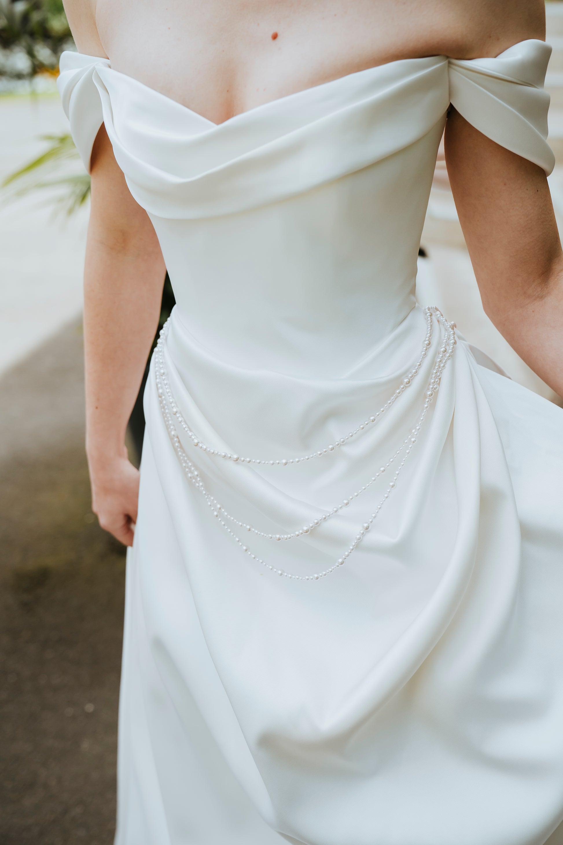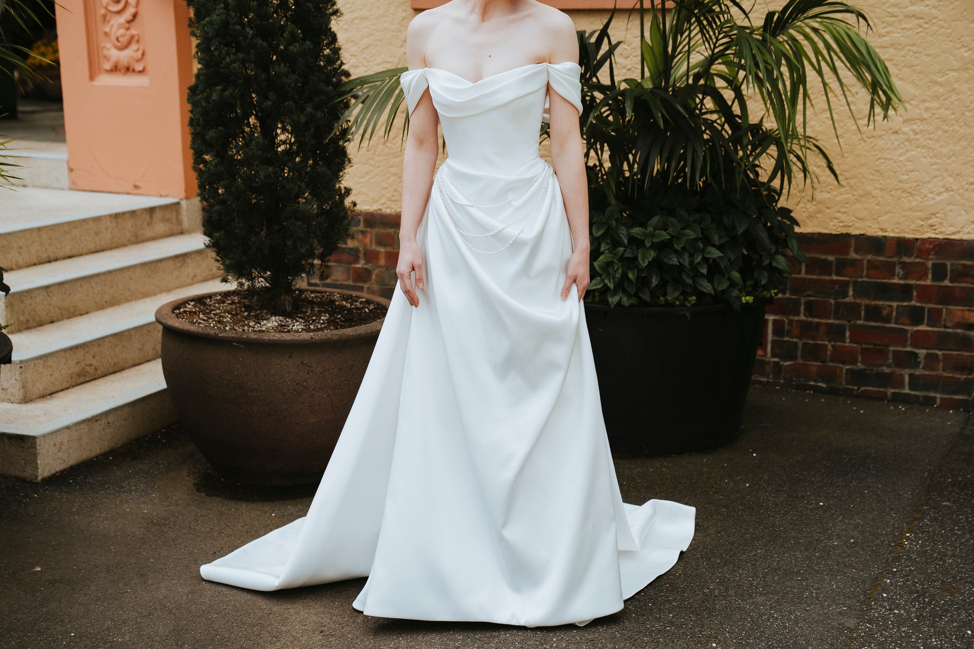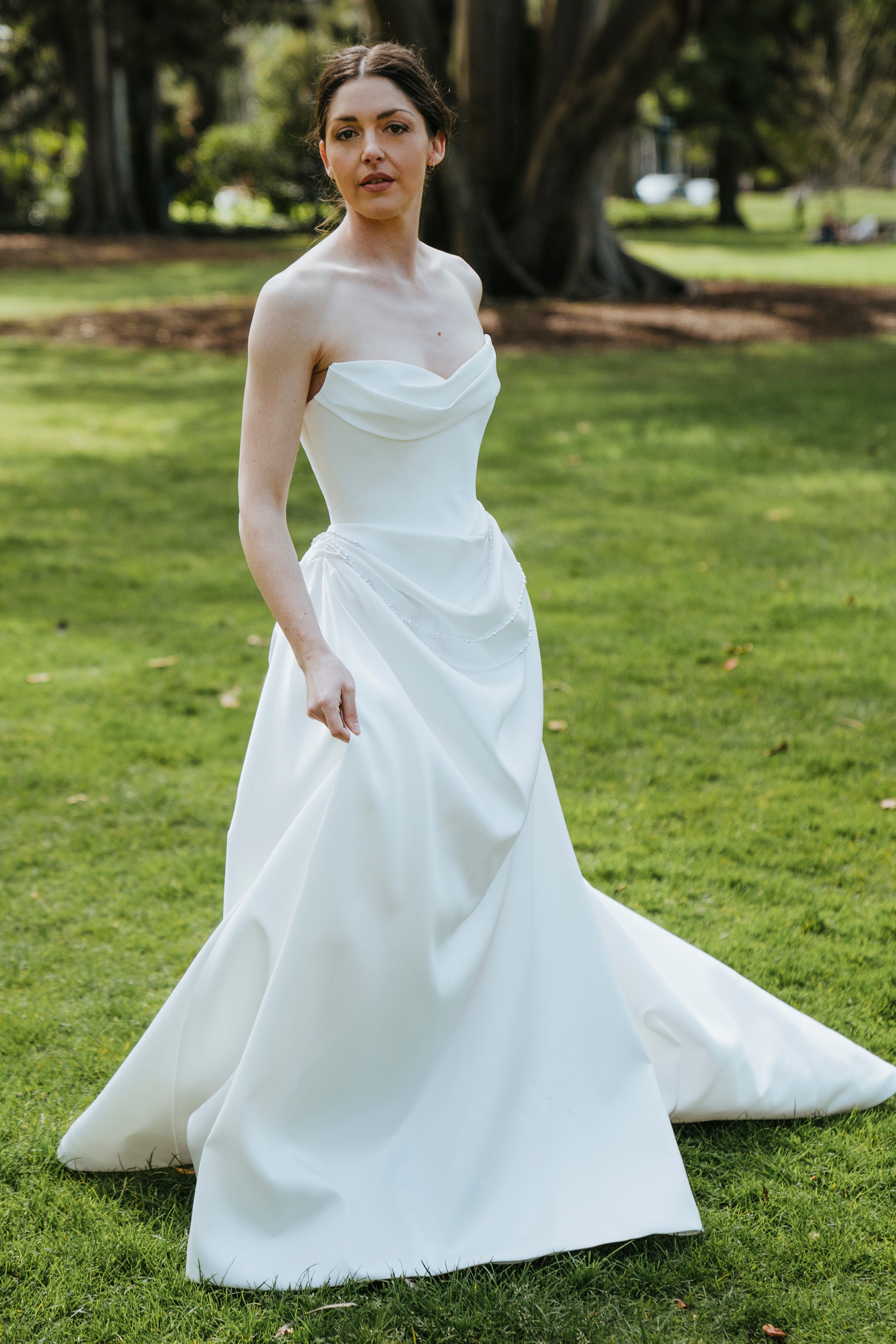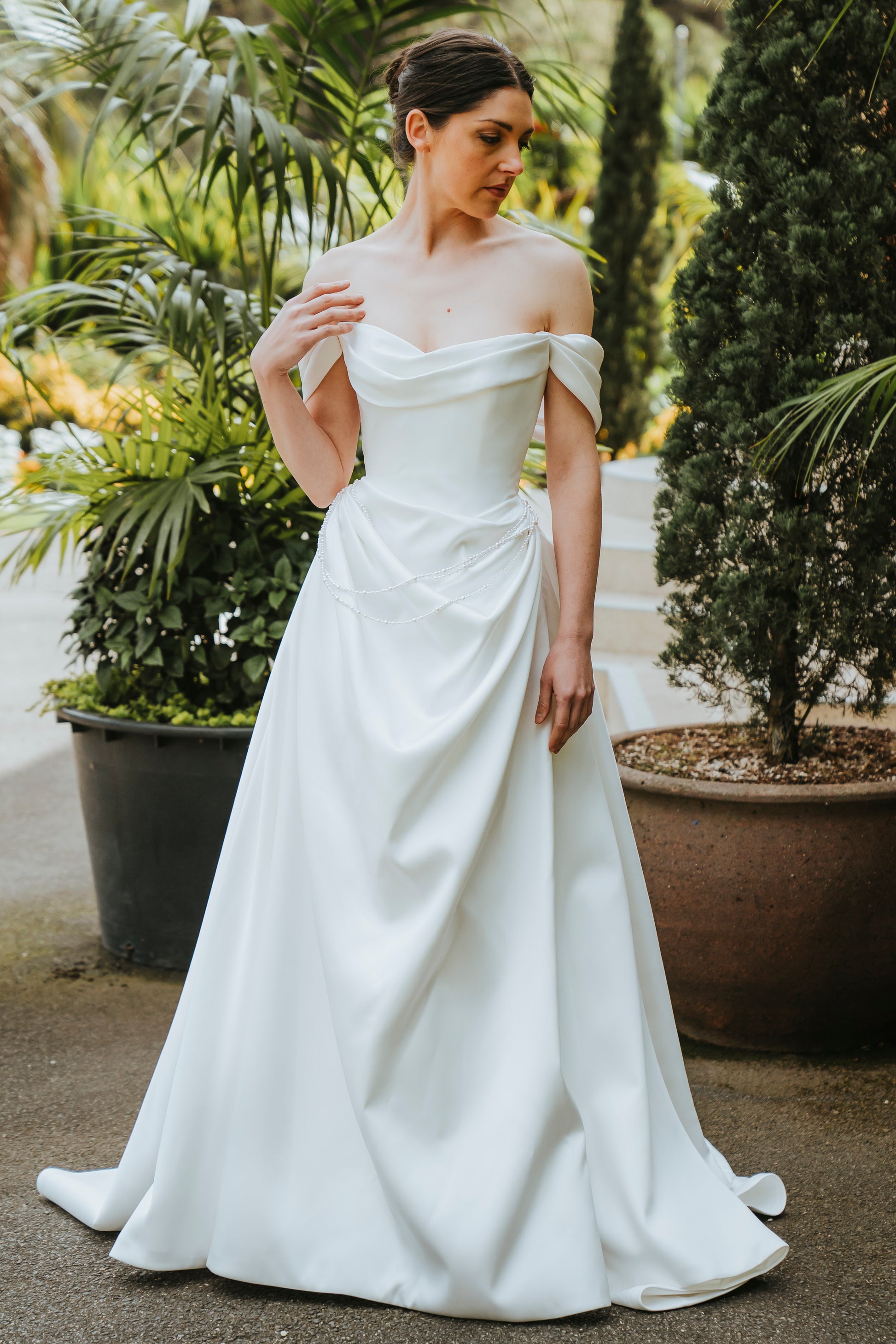 A modern romantic gown with a soft feminine allure. Gigi features a delicately draped bodice with a flattering sweetheart neckline and optional off-shoulder straps that can be removed for a sleek strapless look. The fitted silhouette hugs the figure before flowing into a soft train, balancing timeless elegance with modern charm.