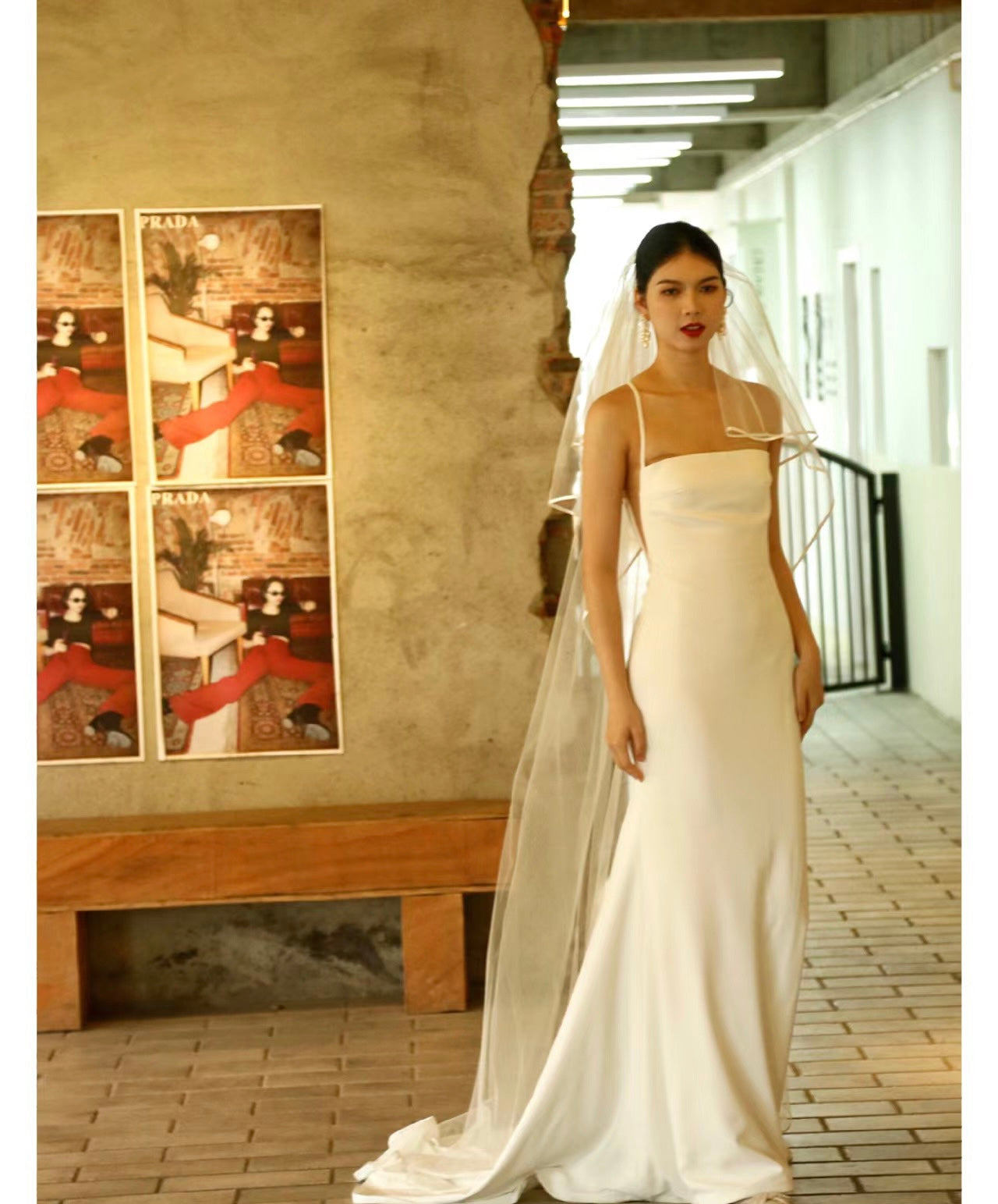 Hannah is the epitome of modern elegance, crafted from luxurious satin with a sleek straight neckline and delicate spaghetti straps. Its minimalist, figure-skimming silhouette flows effortlessly into a subtle train, making it perfect for contemporary brides seeking timeless sophistication. Ideal for any wedding setting, this gown can be made to measure for a personalised touch.