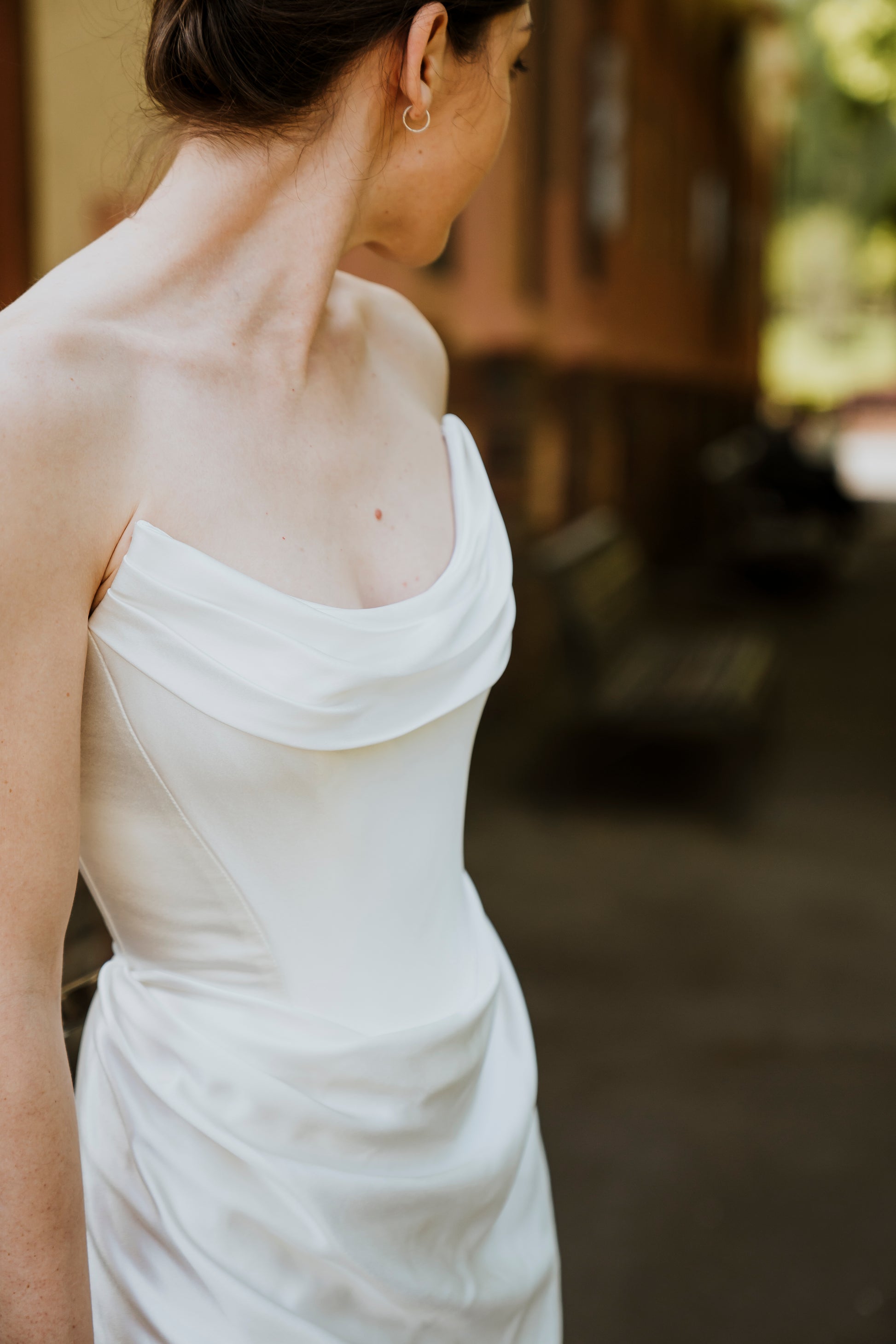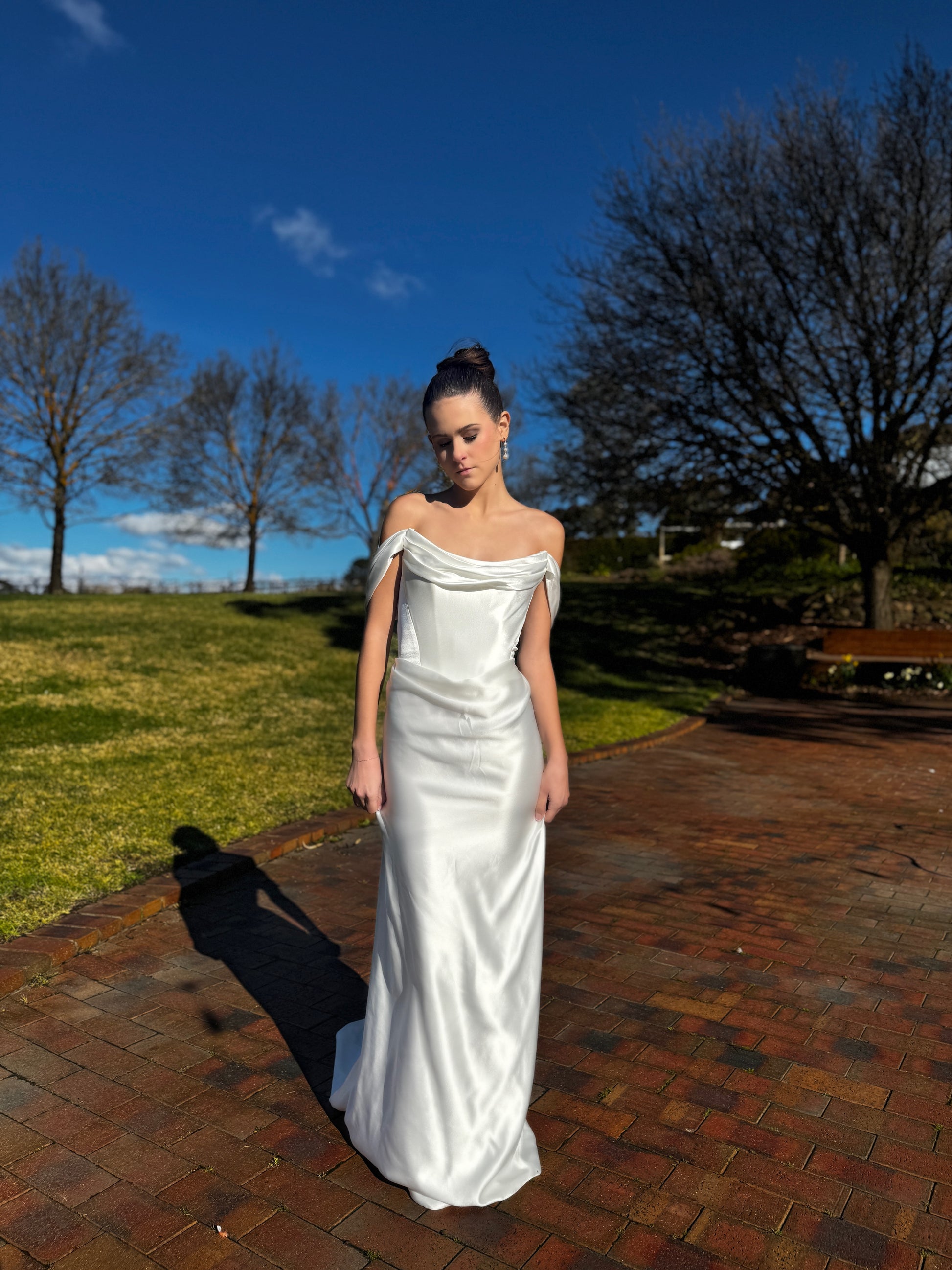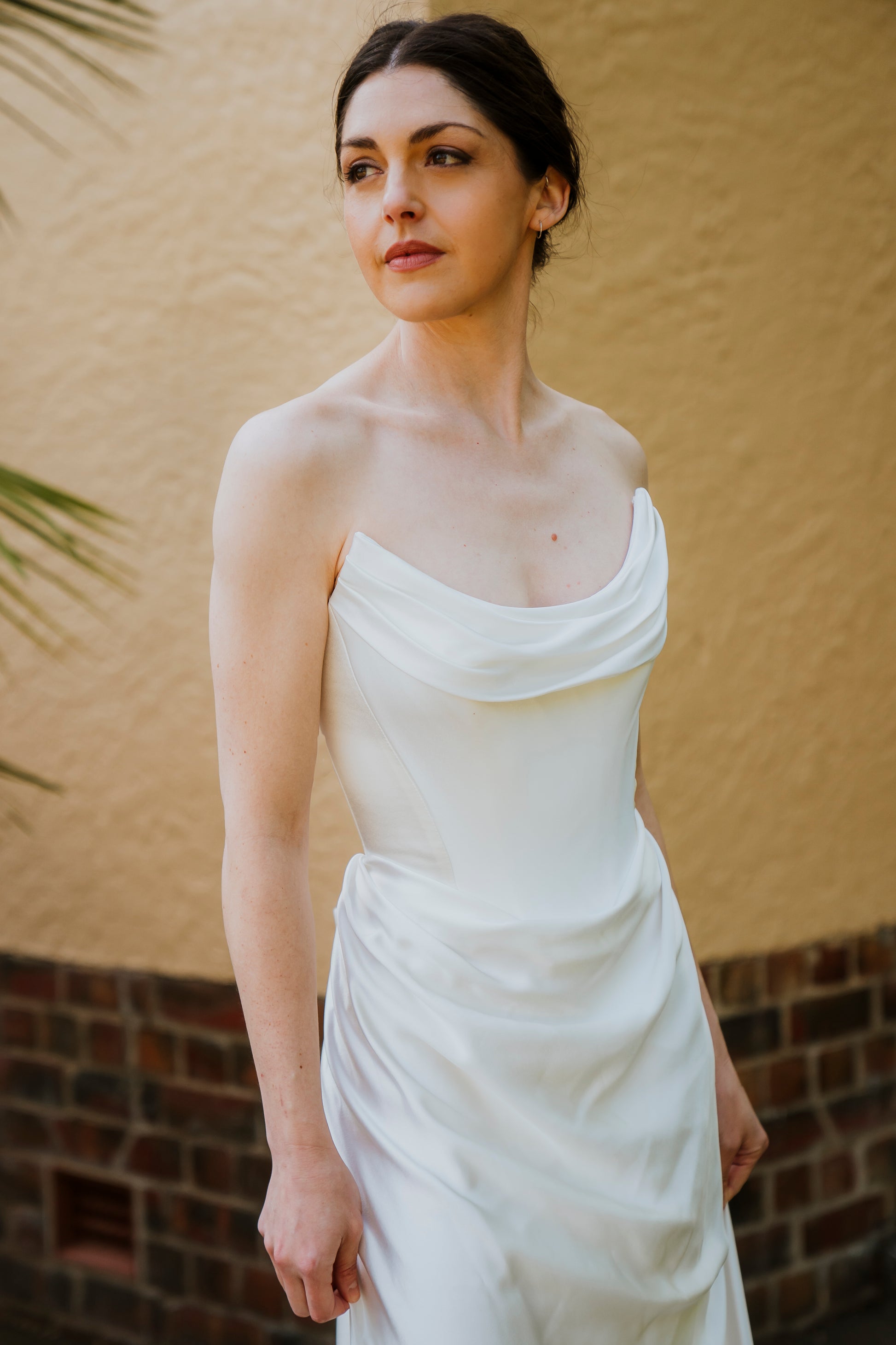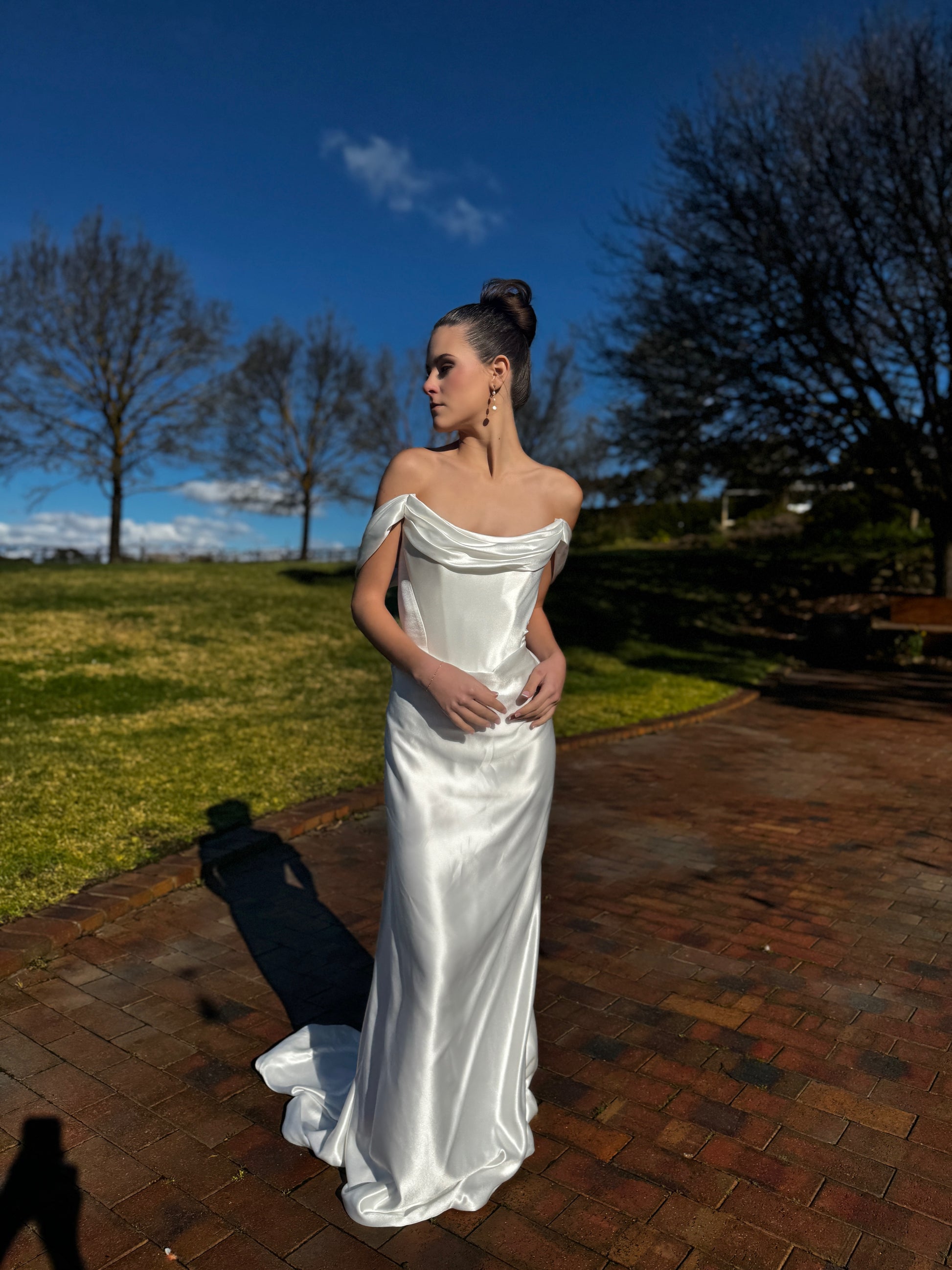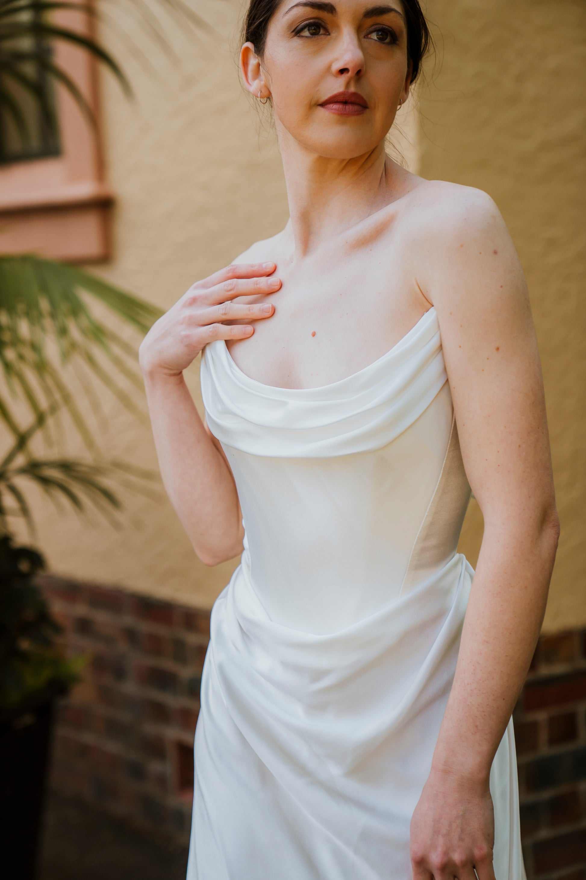 INGRID is an ode to timeless romance and understated luxury, crafted for the bride who desires sophisticated elegance with a touch of Old Hollywood glamour. It glides over the figure, creating a silhouette that is both sensual and exquisitely graceful.