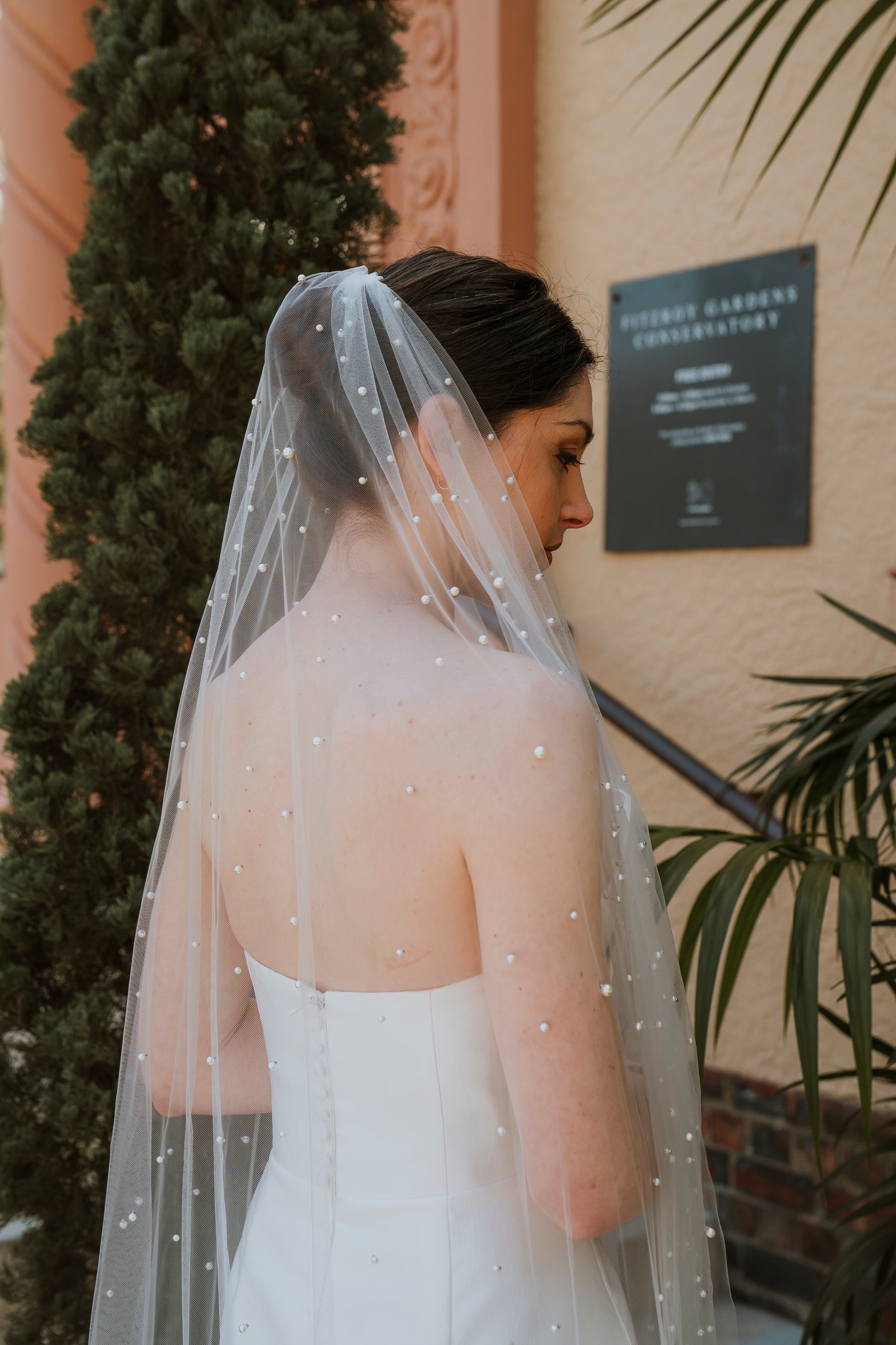 The Lucia Veil is a timeless single-tier design adorned with delicately hand-placed pearls scattered evenly throughout. Crafted from soft ivory tulle, it drapes beautifully to a 2.6m length and 2.4m width, creating an elegant, ethereal look that complements both modern and classic bridal styles.