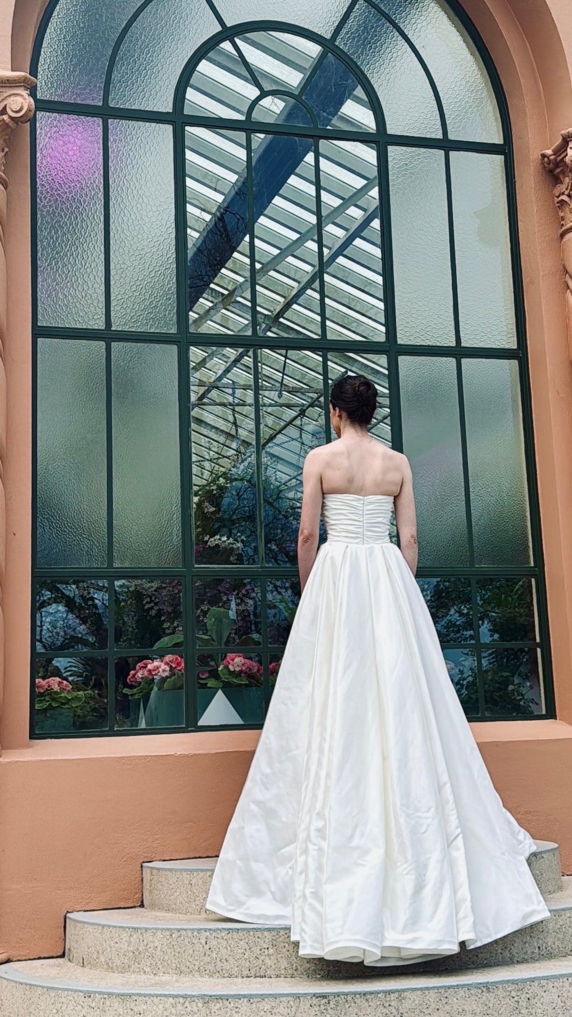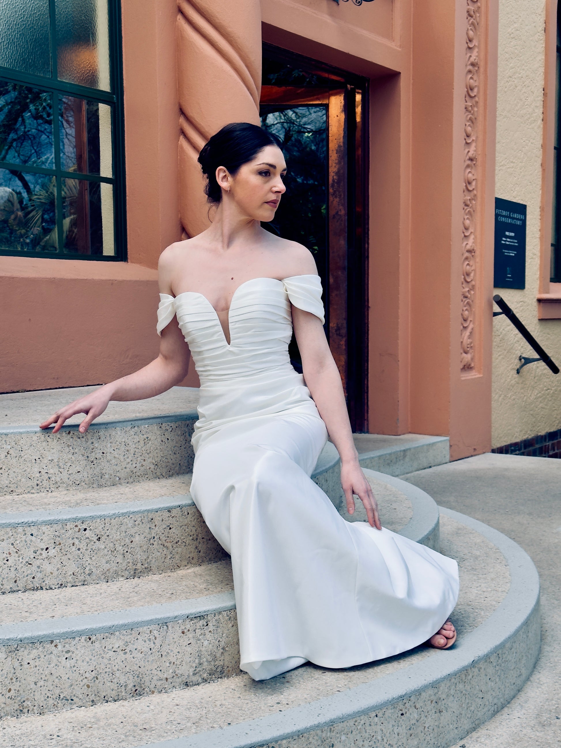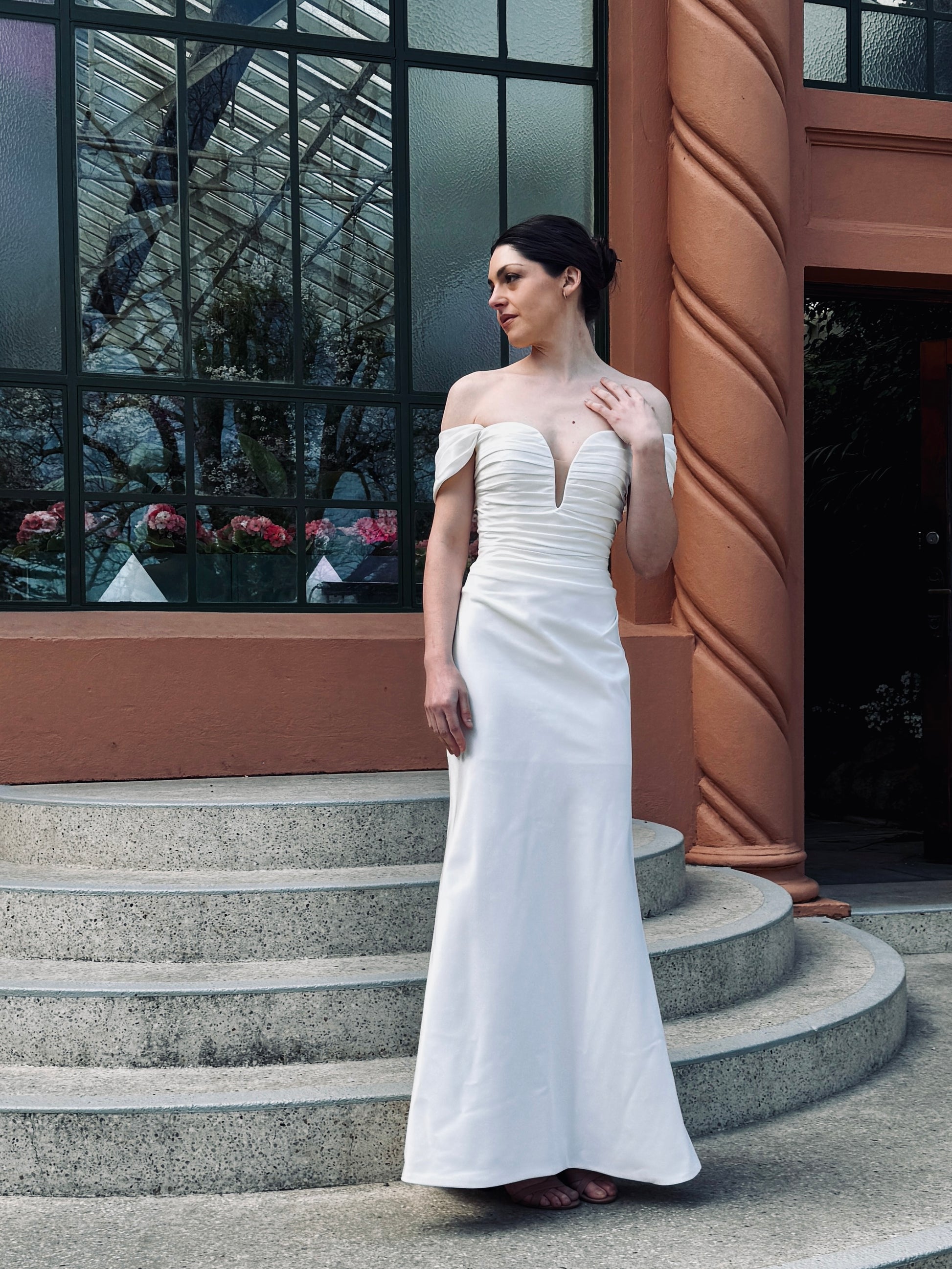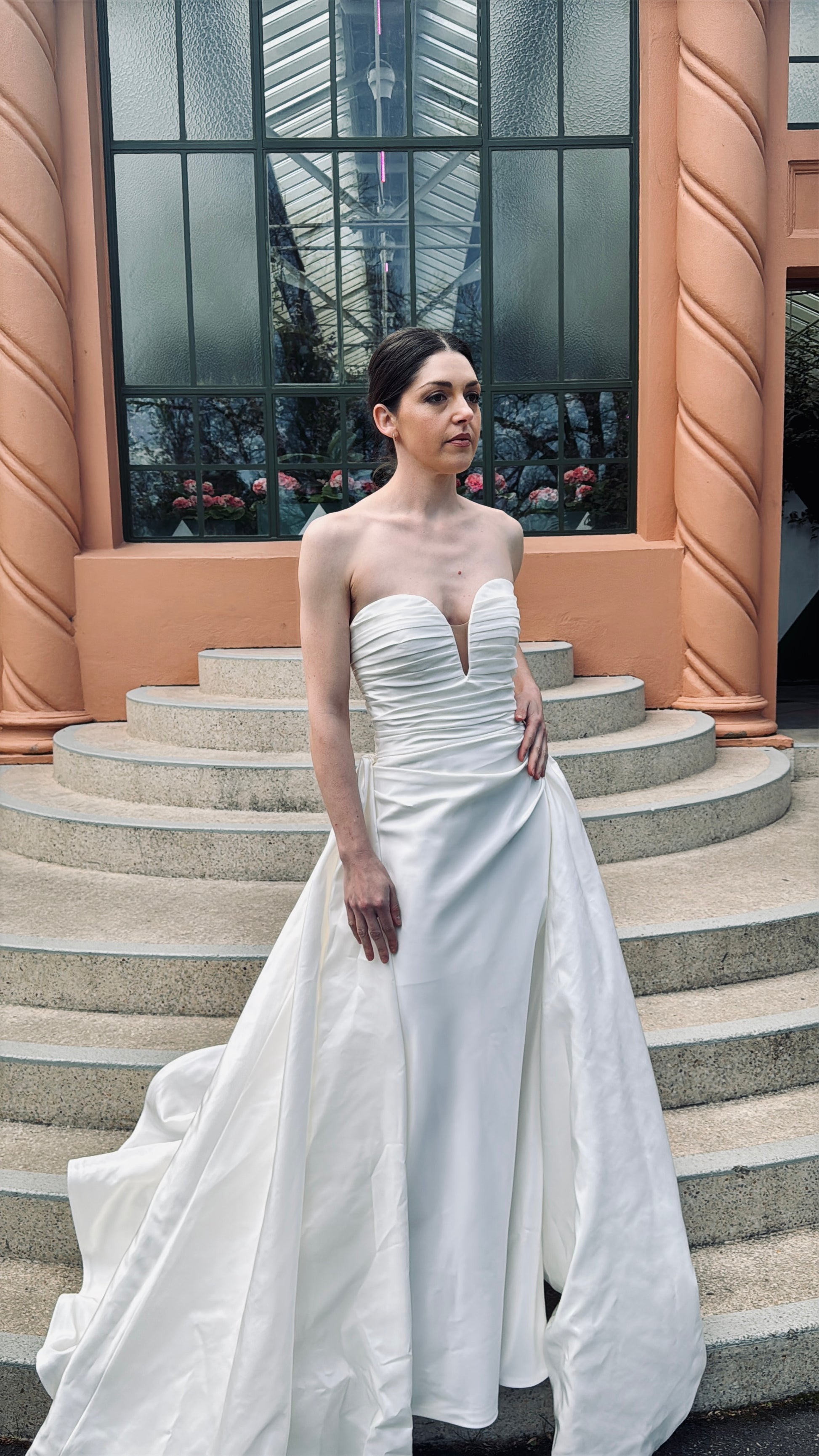 The fitted silhouette accentuates feminine curves, while the overskirt adds volume and regal flair, transforming the look from ceremony to reception with ease. Made for the bride who loves versatility and a touch of drama, Quinny embodies elegance with an editorial edge.