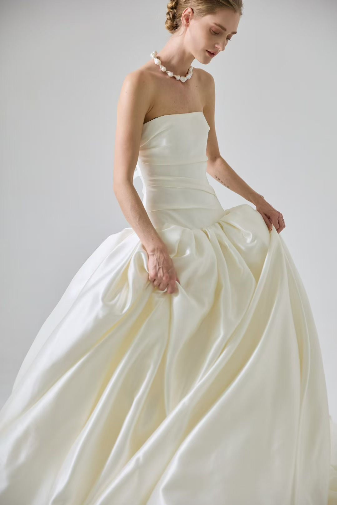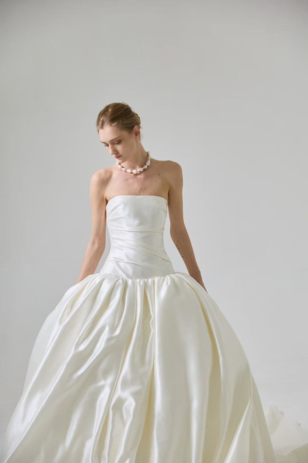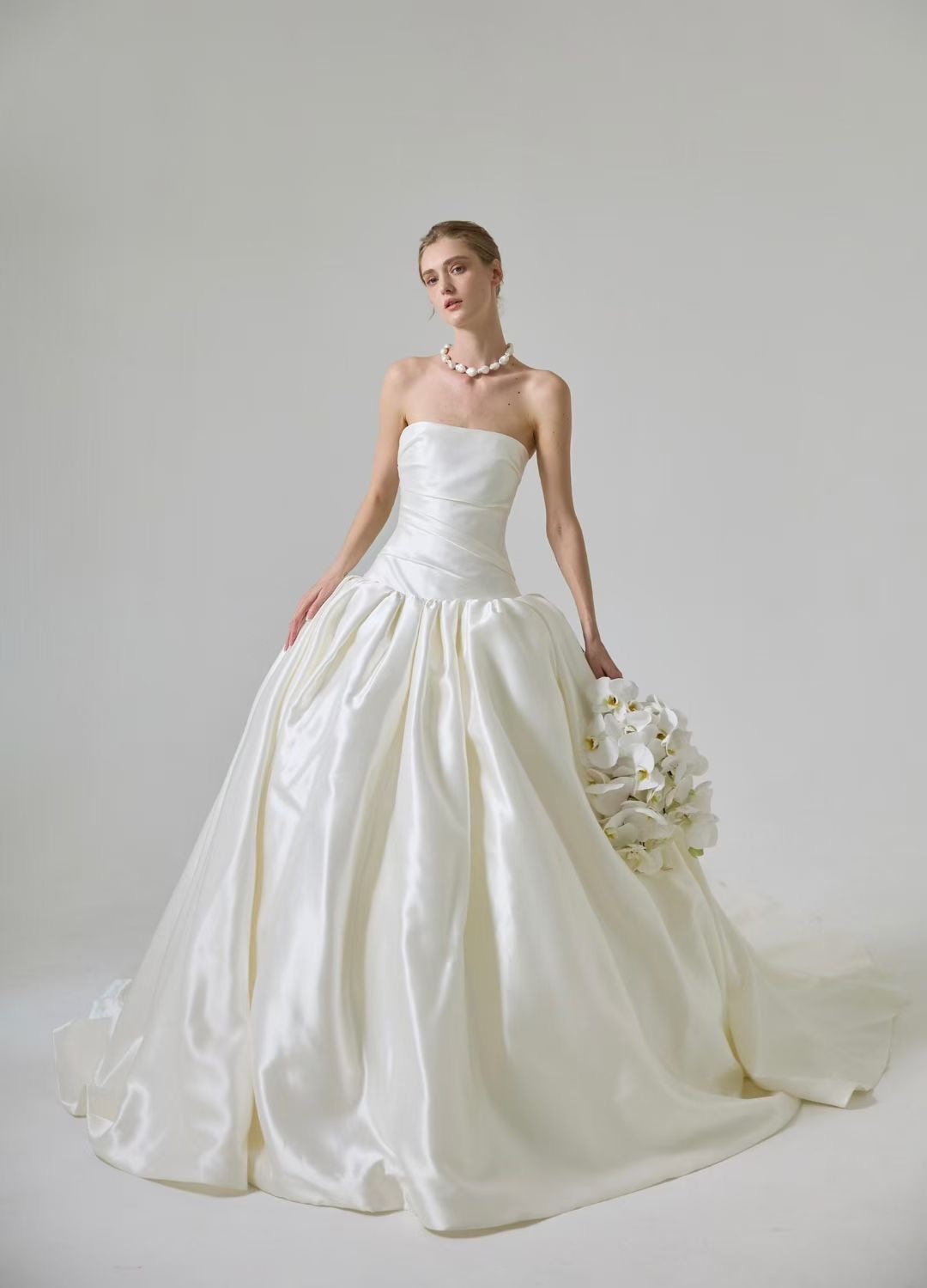 The Victoria gown embodies a timeless grace and sophisticated poise. Crafted from a luxurious, luminous satin, its classic strapless neckline leads to a dramatic drop-waist silhouette and a stunning, full skirt. This is a masterpiece of refined elegance, designed for the bride who wants a dress that will be forever cherished.