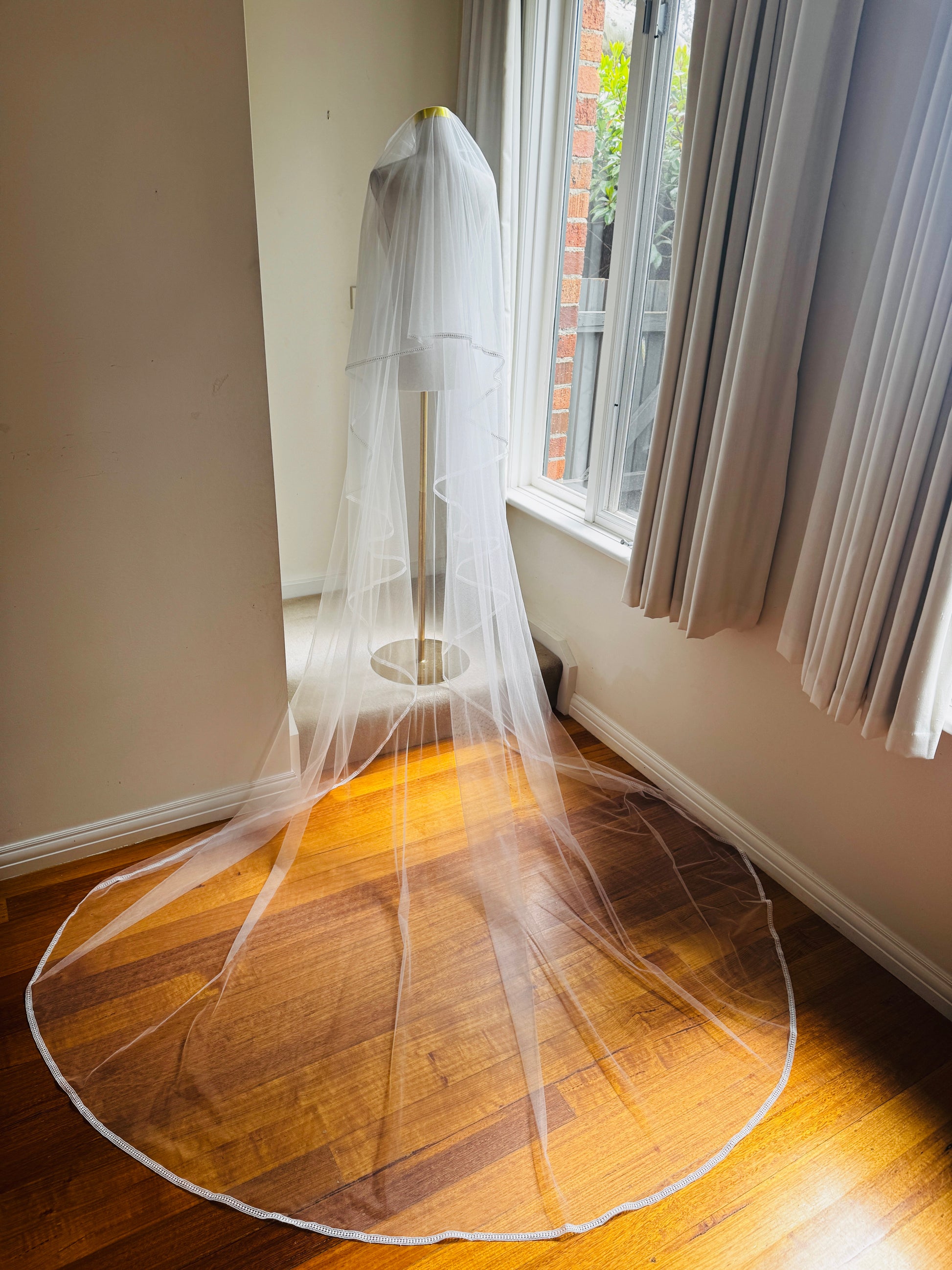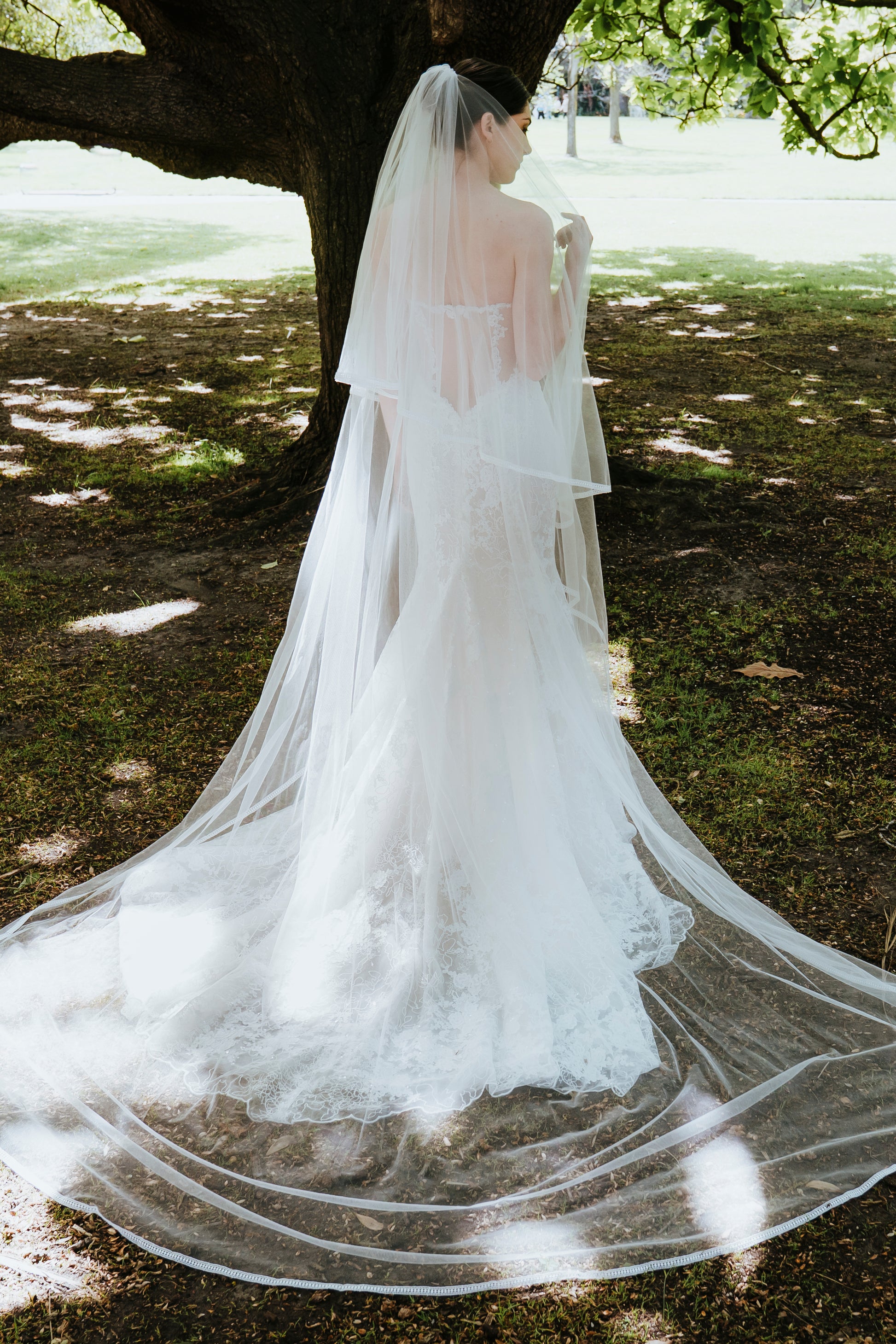 The Isabella Veil adds a touch of romance and classic sophistication, perfect for brides who love traditional beauty with a soft modern twist. It complements both simple and detailed gowns, making it a versatile choice for your wedding day.